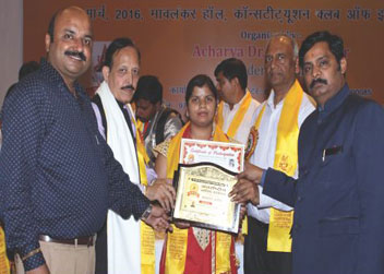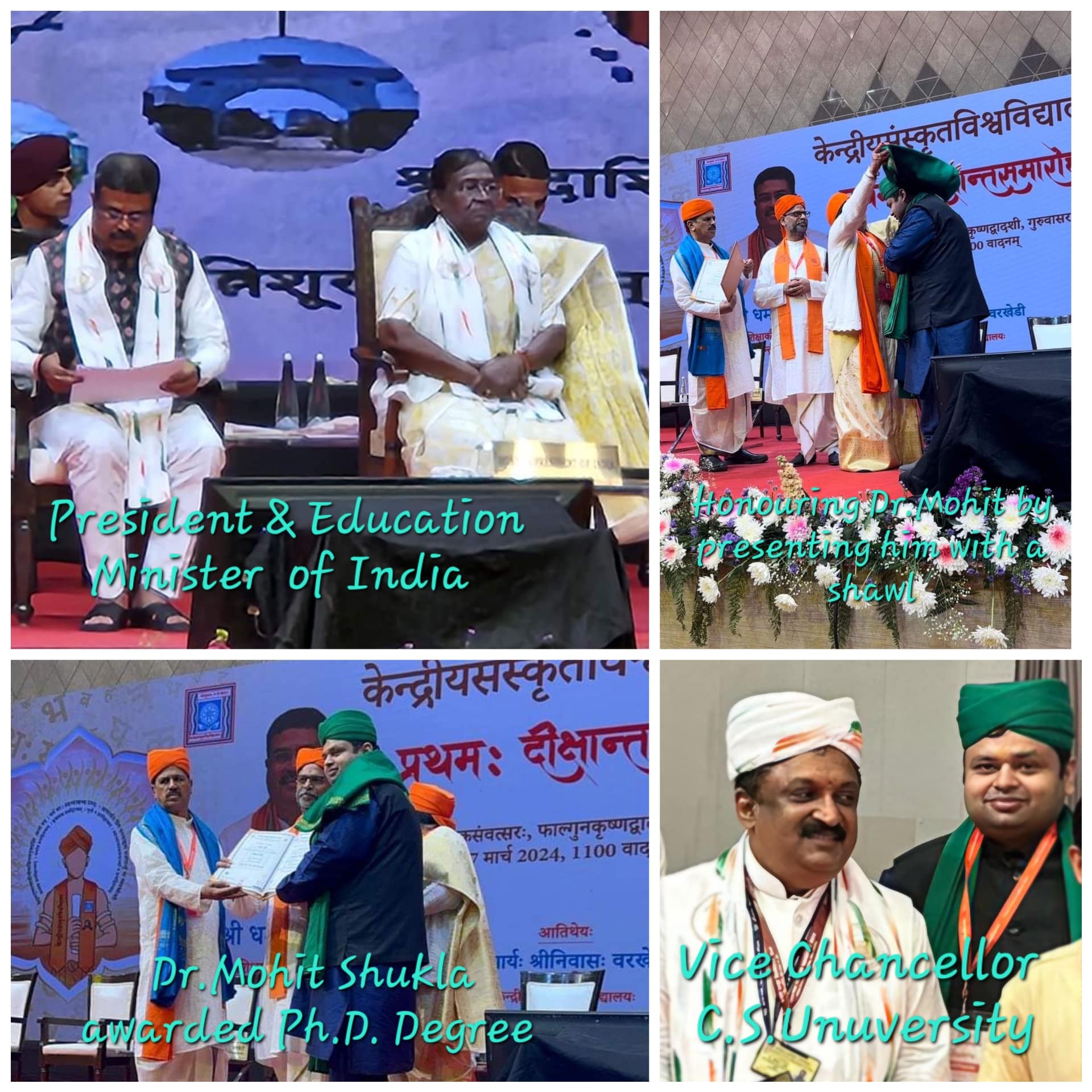 On 7 March, 2024, in the presence of Hon. Mrs. Droupadi Murmu, President of India, as the Chief Guest and under the chairmanship of Hon. Mr. Dharmendra Pradhan, Education Minister of India, Acharya Dr. Mohit Shukla was honoured with a shawl on the stage and awarded the Ph.D. degree.
